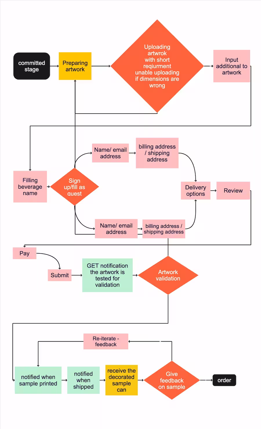 I started with the Sample Order Stage in the MVP to validate product quality and build trust. Users test the product before larger orders, while businesses gather feedback to refine processes. By detailing steps like artwork revisions, sample approval, and urgent orders, a seamless experience is created. A flowchart maps the user journey, and customer feedback helps refine processes for smoother bulk orders and fewer errors.