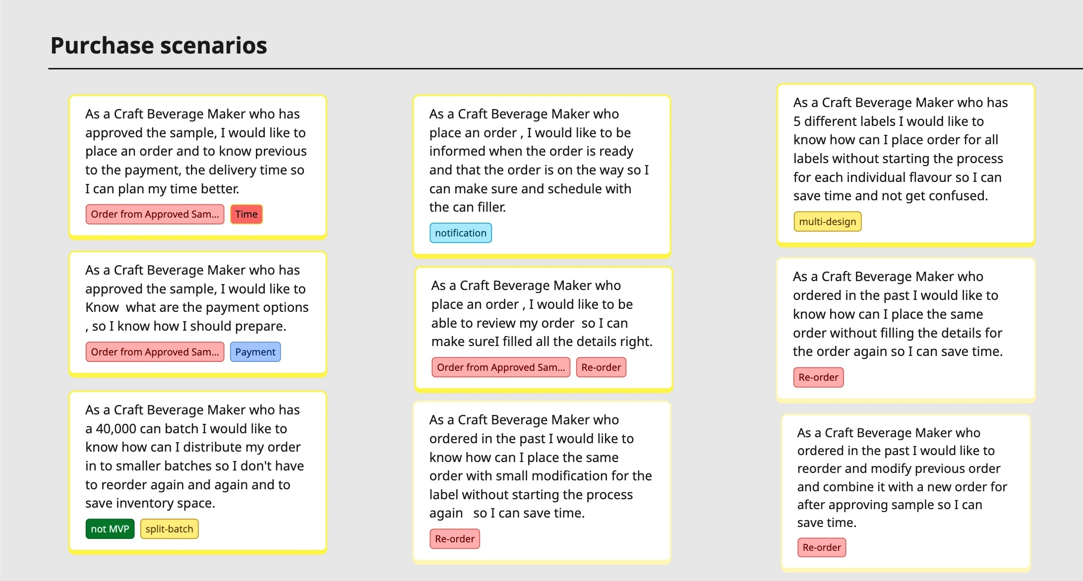 I started with the Sample Order Stage in the MVP to validate product quality and build trust. Users test the product before larger orders, while businesses gather feedback to refine processes. By detailing steps like artwork revisions, sample approval, and urgent orders, a seamless experience is created. A flowchart maps the user journey, and customer feedback helps refine processes for smoother bulk orders and fewer errors.