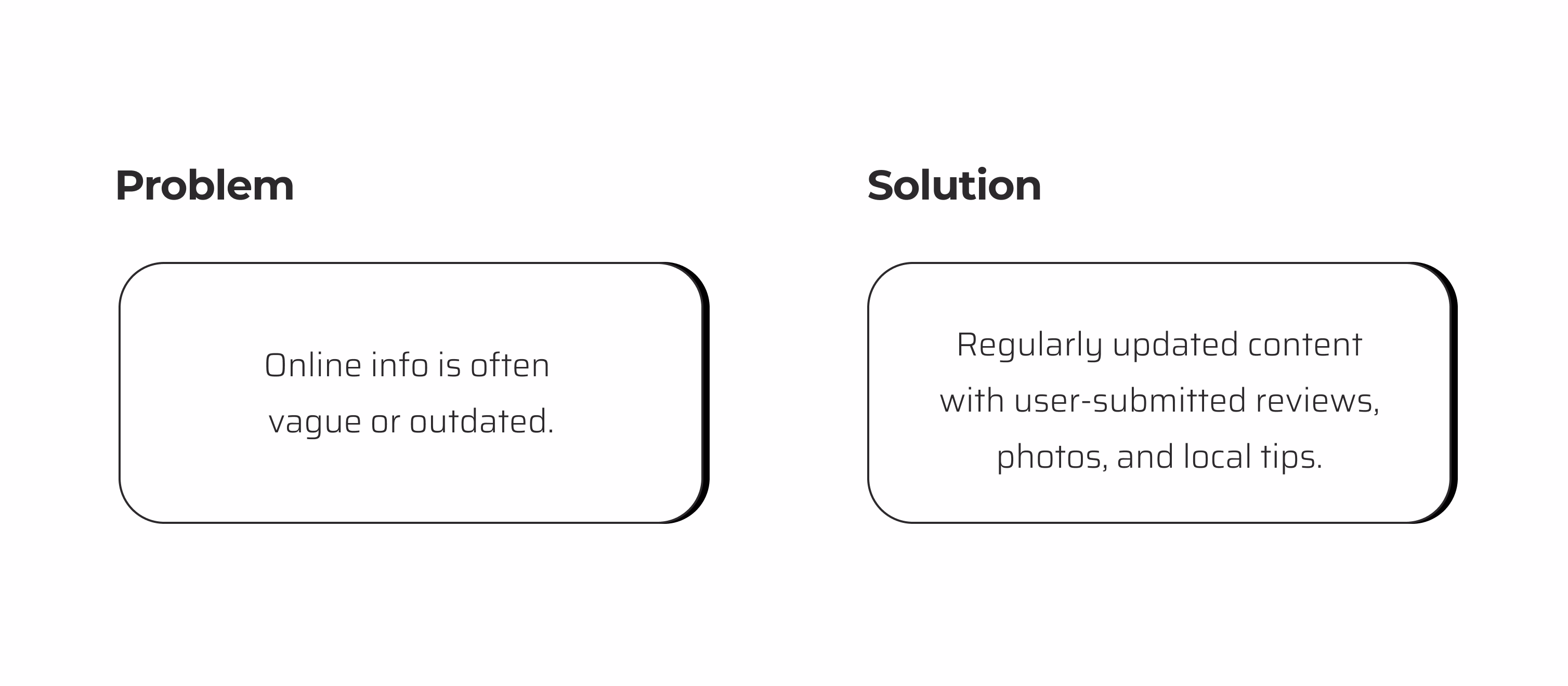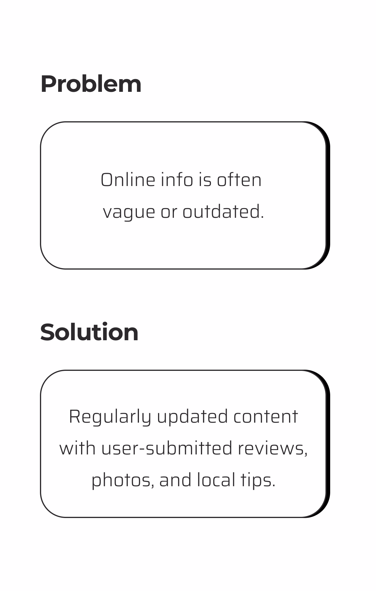 The research phase aimed to gather insights from different users. I started with 5 personas and narrowed them down to 3 main ones, grouped into Locals and Visitors. I identified their shared needs to develop future features that would keep the app relevant and essential.